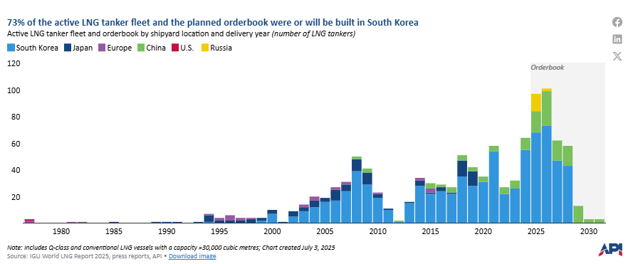 LNG tankers are highly specialized vessels that use cryogenic tanks to maintain very low temperatures to keep the natural gas liquified. At the end of 2024, there were 742 active LNG tankers according to the IGU 2025 LNG report, with 75% built in South Korea, 15% in Japan, and 7% in China. An additional 337 tankers have been ordered for delivery by 2031 with a record 101 vessels expected to be delivered in 2026. The U.S. built several LNG tankers in the 1970’s, but most have been scrapped or are at the end of their lifespan.