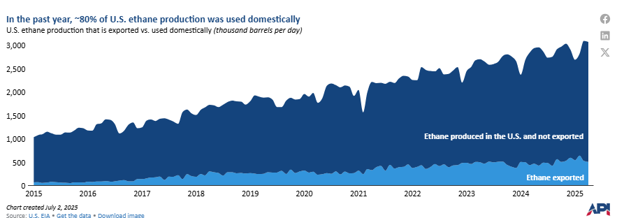 The U.S. produced 2.8 mb/d of ethane in 2024, up 1.0 mb/d or 55% since 2019. This is faster growth than U.S. crude oil production, which increased by 0.9 mb/d over the same period. Around 80% of U.S. produced ethane is used domestically and ~20% is exported. The U.S. is the only major waterborne exporter of ethane in the world. Ethane is a petrochemical feedstock used primarily for plastics manufacturing. Over the past year, nearly half of U.S. ethane exports went to China and 19% to the EU and UK.