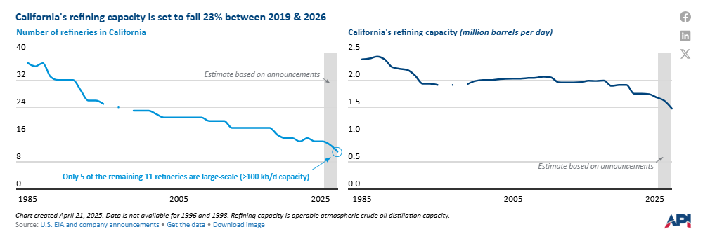 The number of refineries operating in California has fallen from 23 in 2000 to 14 at the beginning of 2024, according to the latest data from U.S. EIA. The number of refineries is expected to drop to 11 by the end of 2026 as one refinery was converted to renewable fuels in mid-2024, and two additional large-scale refineries (>100 kb/d capacity) are planned to close in 2025-26. Of the 11 remaining refineries, only five are large-scale and produce substantial quantities of transportation fuels. Companies have cited rising regulatory compliance costs and weak refining margins as contributing factors for the closures.